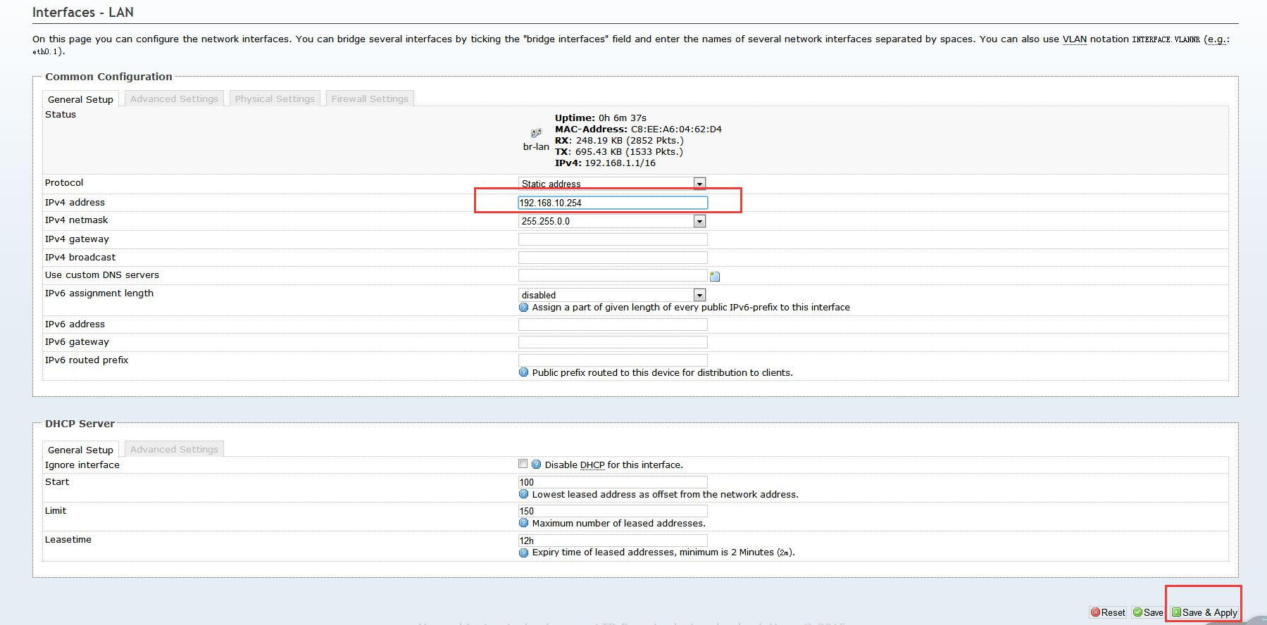 3.7  修改 IP 为 192.168.10.254 并点击“Save&Apply”。(其他配置均不需要改变)